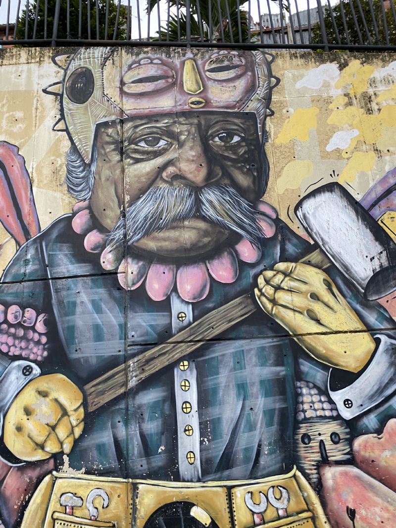 A colorful brick wall has been broken. Each brick it’s own color, laying in pieces on the ground. A man comes and starts picking up each piece, ...
